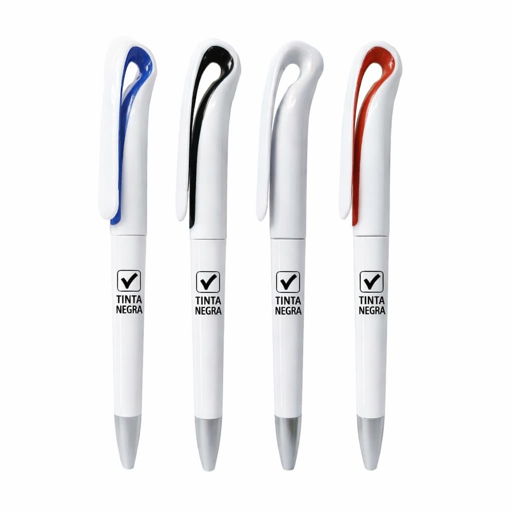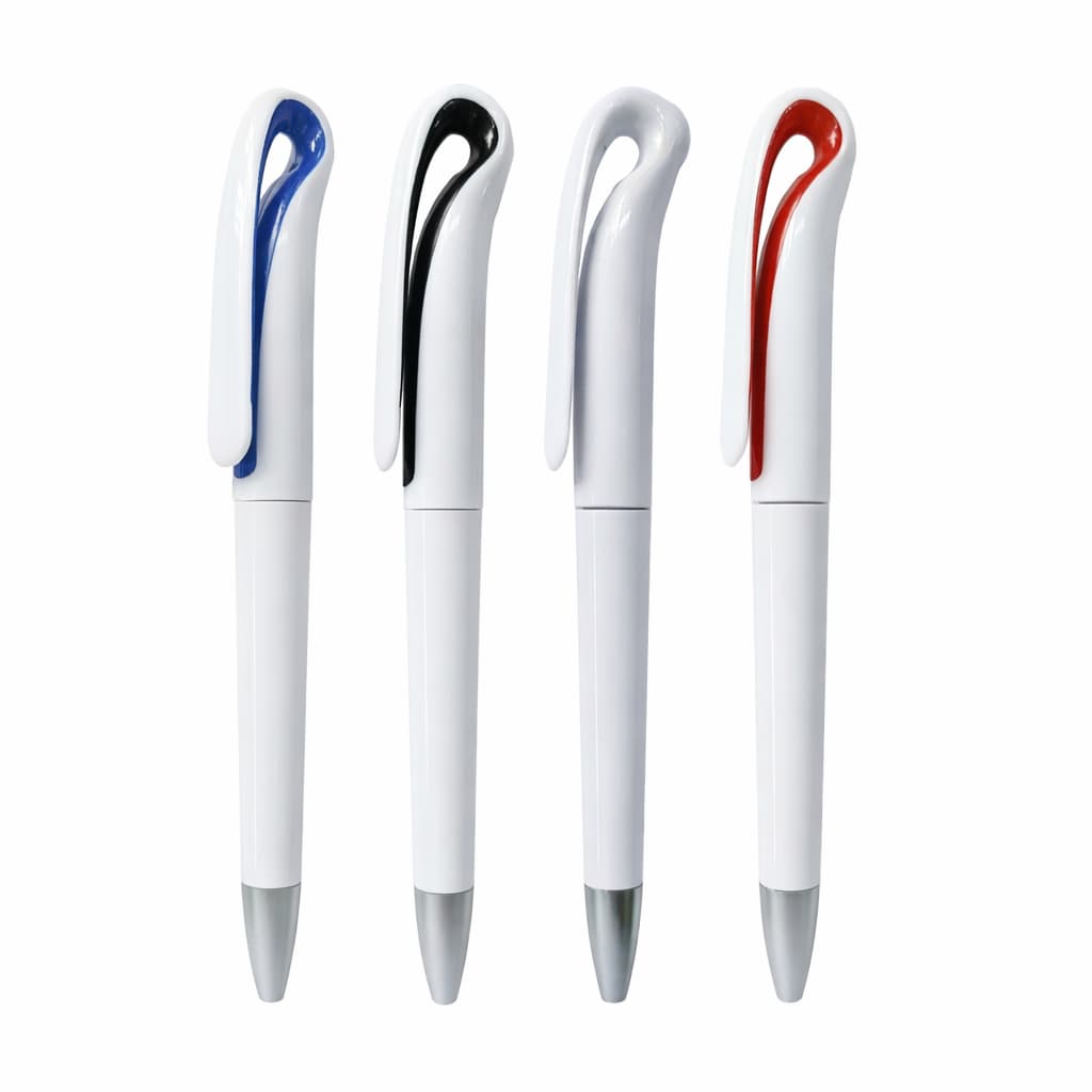 Bolígrafo plástico de diseño moderno con cuerpo blanco y detalles en colores, ideal para personalización con logotipo y uso promocional. Su estilo elegante lo convierte en una excelente opción para campañas publicitarias, eventos corporativos y merchandising empresarial.