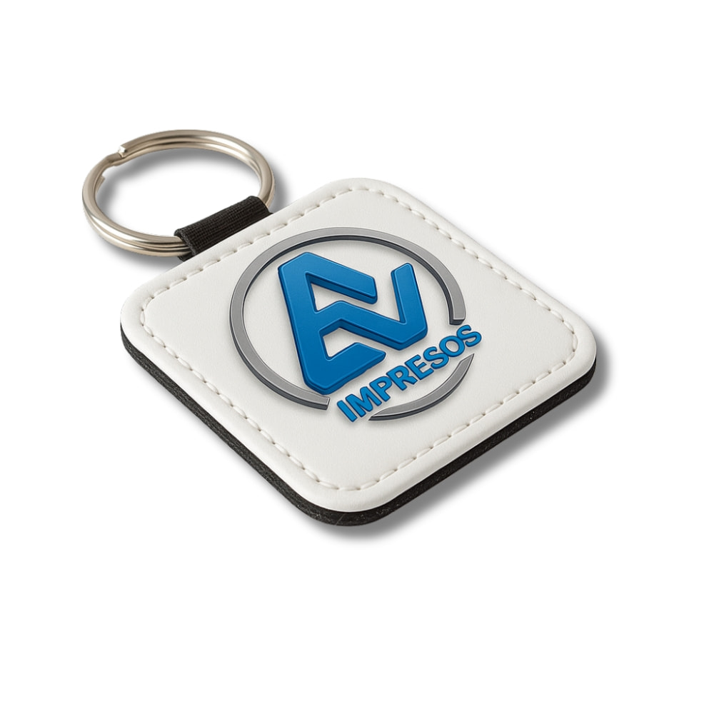 Llavero cuadrado de PU blanco para sublimación. Reverso capa PU negro con brillo (no sublimable). Argolla de Acero inoxidable.